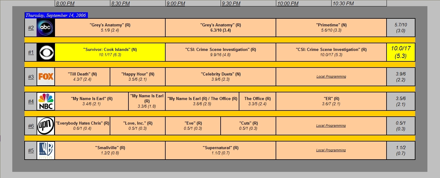 Broadcast TV Ratings for Thursday, September 14, 2006 September 15, 2006 3:30 pm