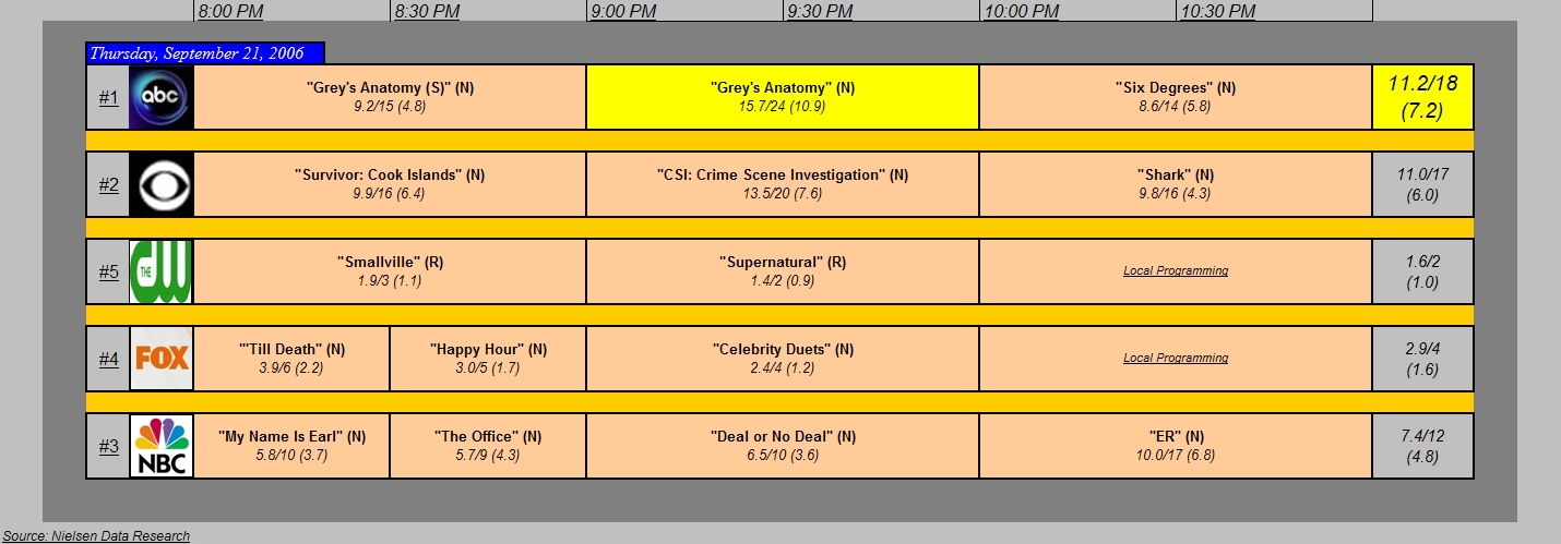 Broadcast TV Ratings for Thursday, September 21, 2006 September 22, 2006 12:49 pm