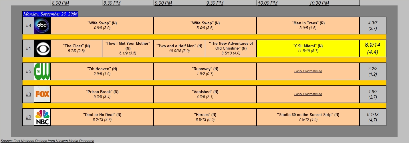 Broadcast TV Ratings for Monday, September 25, 2006 September 26, 2006 1:01 pm