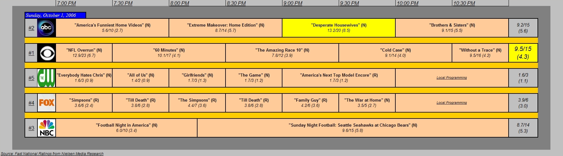 Broadcast TV Ratings for Sunday, October 1, 2006 October 2, 2006 7:46 pm