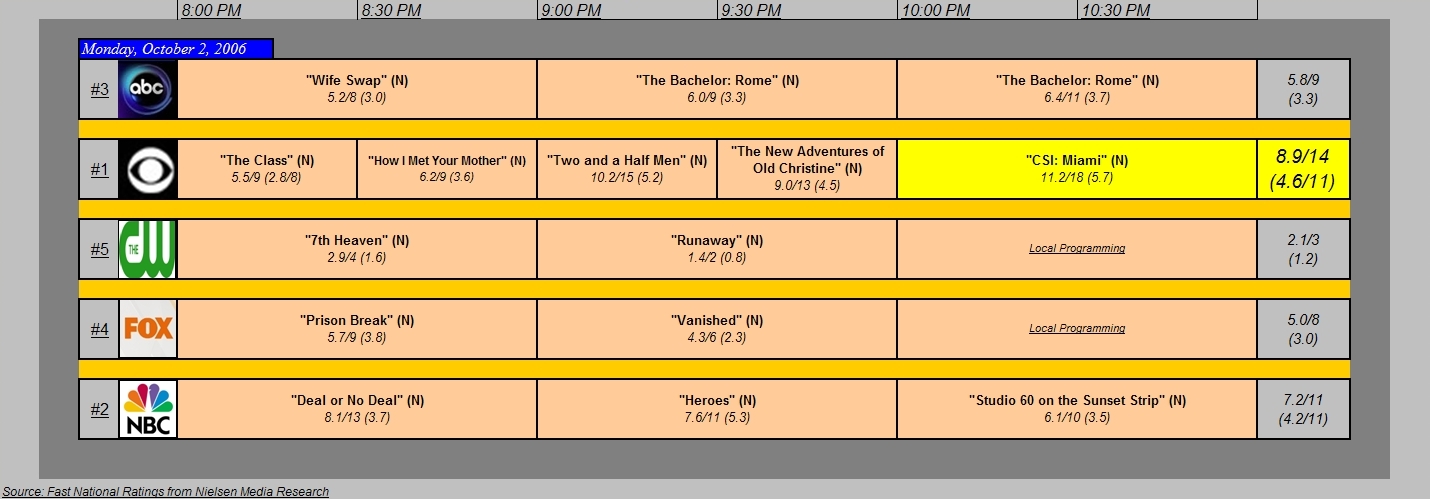 Broadcast TV Ratings for Monday, October 2, 2006 October 3, 2006 11:24 pm