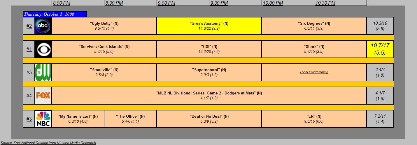 Broadcast TV Ratings for Thursday, October 5, 2006 October 6, 2006 3:46 pm