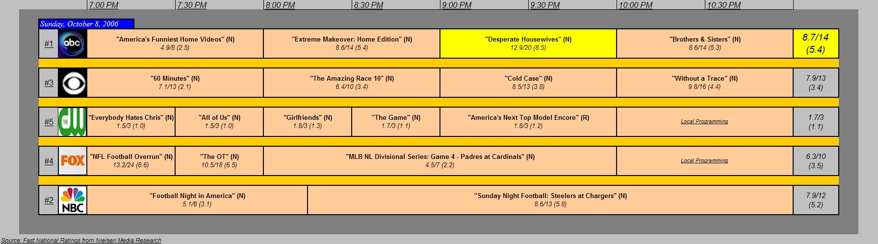 Broadcast TV Ratings for Sunday, October 8, 2006 October 9, 2006 7:09 pm