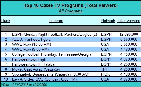 The chart for the top 10 cable programs for the week ending 10/8/2006 in terms of viewers.