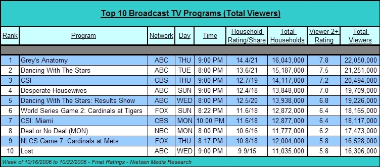 Top 10 broadcast TV shows for the week of 10/9/2006 to 10/15/2006 in terms of viewers and A18-49 (click to enlarge)