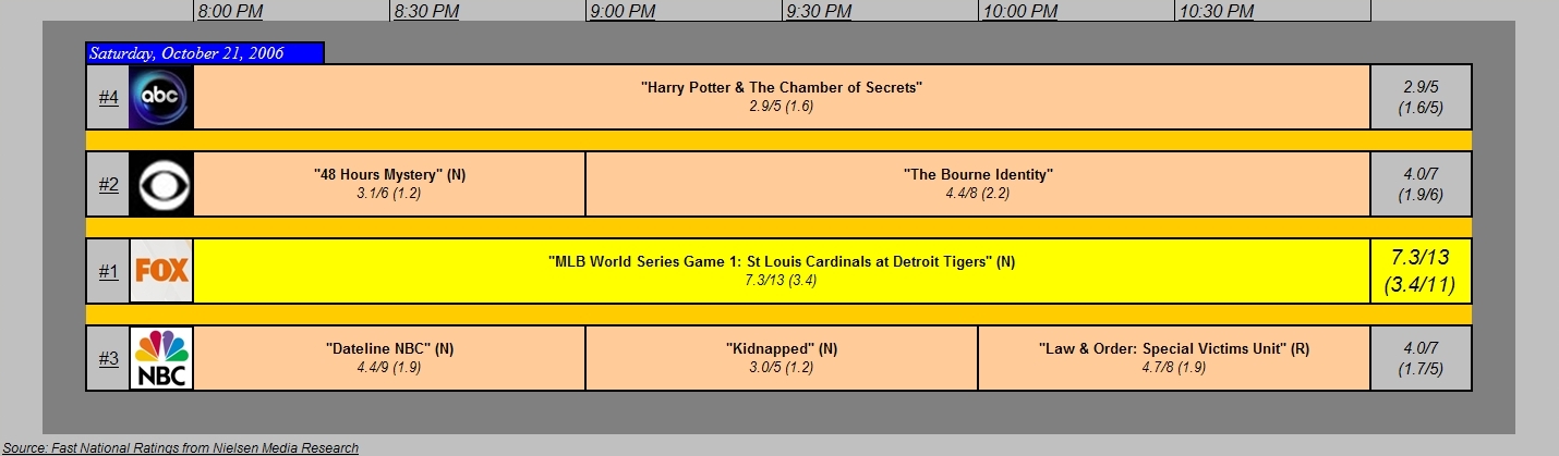 Broadcast TV Ratings for Saturday, October 21, 2006 October 22, 2006 10:32 pm