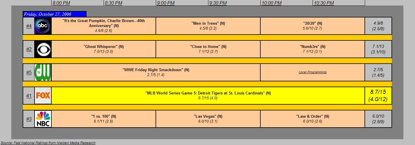Broadcast TV Ratings for Friday, October 27, 2006 October 28, 2006 2:19 pm