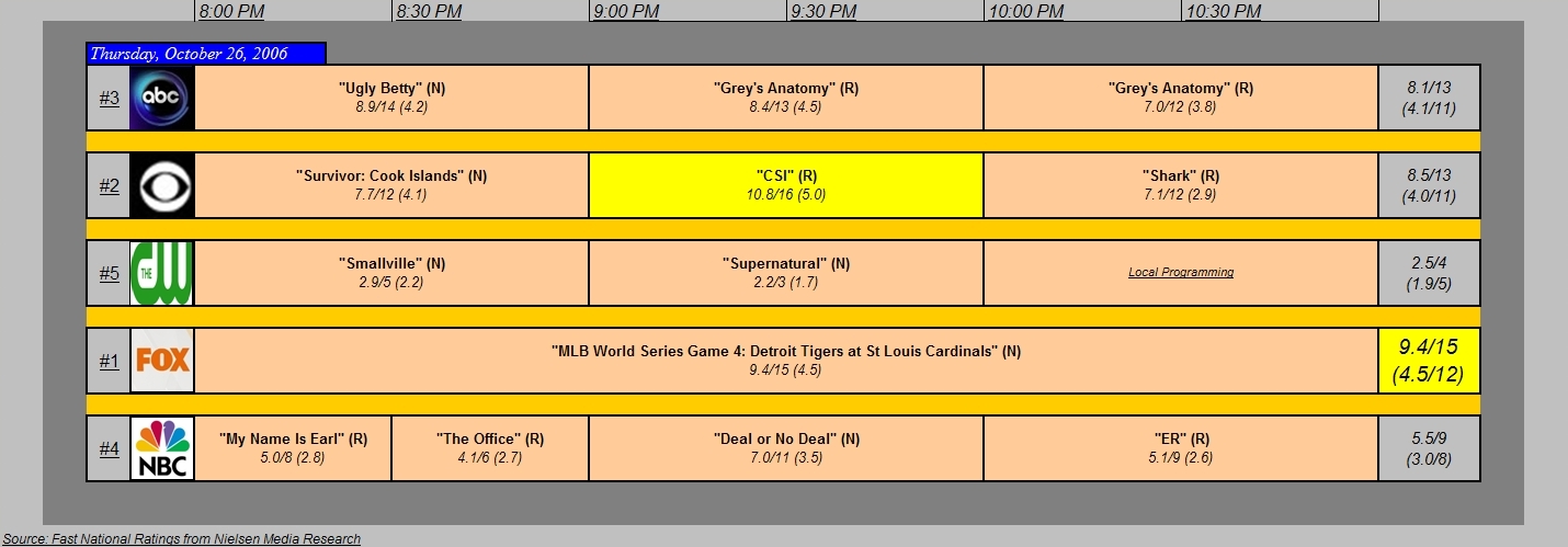 Broadcast TV Ratings for Sunday, October 29, 2006 October 30, 2006 8:15 pm