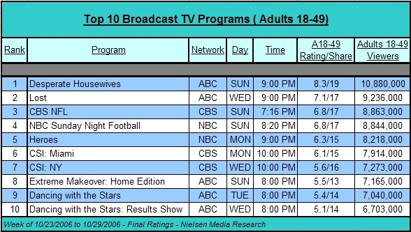 Top 10 broadcast TV shows for the week of 10/23/2006 to 10/29/2006 in terms of viewers and A18-49 (click to enlarge)