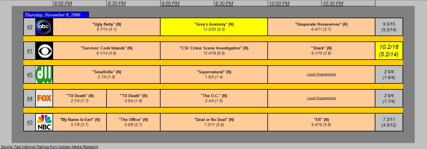 Broadcast TV Ratings for Thursday, November 9, 2006 November 10, 2006 4:18 pm