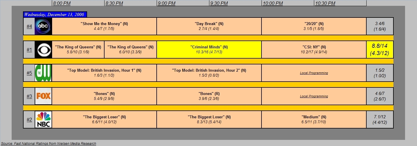 Broadcast TV Ratings for Wednesday, December 13, 2006, December 14, 2006 9:01 pm
