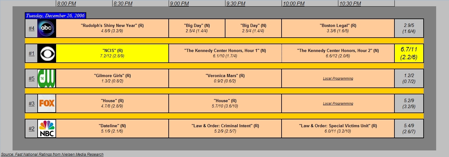 Broadcast TV Ratings for Tuesday, December 26, 2006 December 27, 2006 7:20 pm