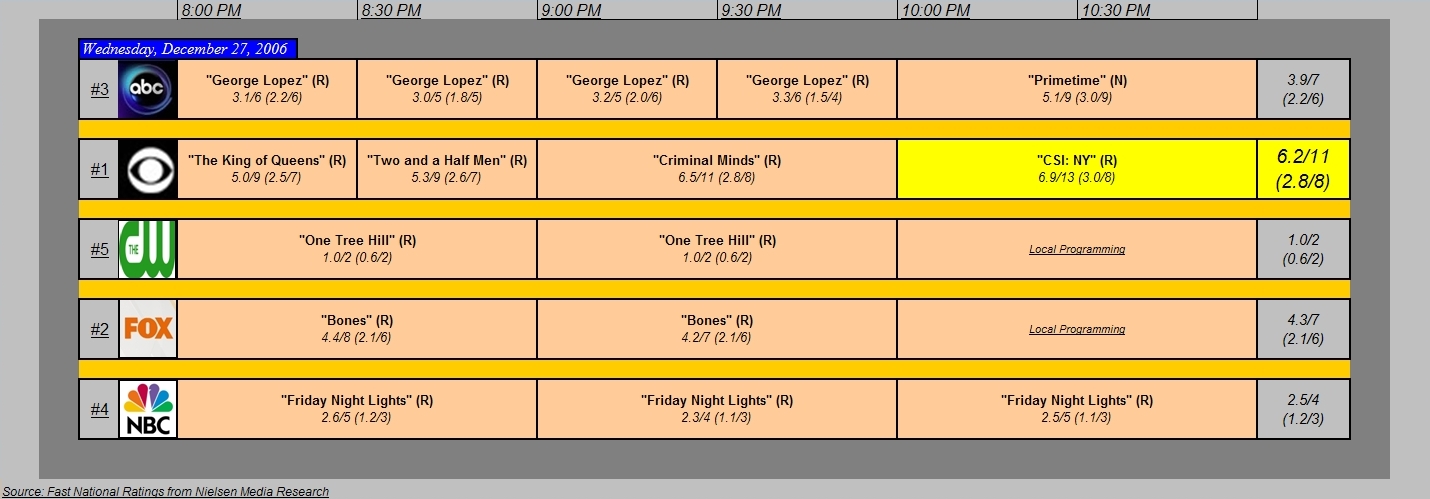 Broadcast TV Ratings for Wednesday, December 27, 2006 December 28, 2006 7:34 pm