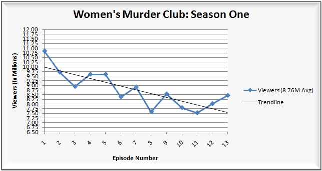 - 10:00 (10:02) p.m.: The season one finale of Women’s Murder Club (5.8/10 HH rating/share, 8.46M viewers, 2.1/6 A18-49 rating/share).