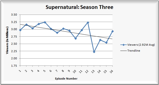 • 9:00 p.m.: The third season finale of Supernatural (1.9/3 HH rating/share, 2.93M viewers, 1.2/3 A18-49 rating/share).