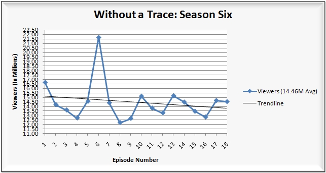 • 10:00 p.m.: The sixth season finale of Without a Trace (9.6/16 HH rating/share, 14.54M viewers, 3.6/10 A18-49 rating/share).