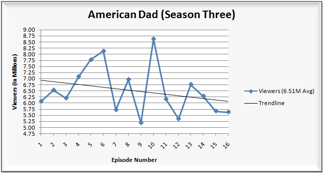 • 9:30 p.m.: The third season finale of American Dad (3.6/6 HH rating/share, 5.63M viewers, 2.7/7 A18-49 rating/share) ended the evening for Fox.  The narrative here isn’t much changed, as American Dad was off from the year prior, and also had a downward trending season.