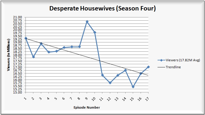 • 10:00 p.m.: That led into the fourth season finale of Desperate Housewives (11.0/18 HH rating/share, 17.02M viewers, 6.3/16 A18-49 rating/share).  The good news was that the series managed to build upon the previous episode, but was still off a good deal from last season’s finale (1.80 million/10% among viewers and 12.5% among adults 18-49).  As you can see from the posted chart below, the series actually started off its new season in an okay setting, slowly building to its midseason finale on December 6, 2007, which posted a season high 20.65M viewers.  Ever since that point though, the show has been on a downward trend, which is clearly reflected in the chart.  Put another way, check out the averages for the two part season; 2007: 18.78M viewers, 2008: 16.74M viewers.  That’s a loss of 2.04 million viewers/11%. The WGA strike was NOT favorable to the housewives.