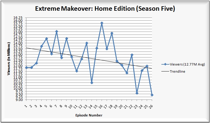 • 8:00 p.m.: And the final hour of the fifth season finale of Extreme Makeover: Home Edition (7.0/12 HH rating/share, 11.15M viewers, 3.8/11 A18-49 rating/share), as expected, grew solidly from the first hour of the finale. However, while the first hour improved upon last year’s comparable hour, the same was not true for the second hour.  The series was off by 1.42 million viewers/11% among viewers and 16% among adults 18-49 from last year’s second hour of the season finale.  Overall, as you can see from the posted chart below, the season was going solidly for the majority of the season, but it hasn’t fared as well in recent weeks, contributing to the slight downward trendline.