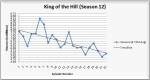 • 8:30 p.m.: The 12th season finale of King of the Hill (3.3/5 HH rating/share, 5.41M viewers, 2.6/7 A18-49 rating/share).  Despite also having a downward trend throughout the season, King of the Hill was able to actually match its year-ago season finale performance, growing by 190,000/4% among viewers and a more signficant 13% among adults 18-49.