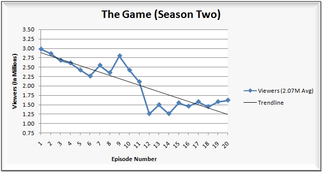 • 9:00 p.m.: The second season finale of The Game (1.1/2 HH rating/share, 1.62M viewers, 0.8/2 A18-49 rating/share).