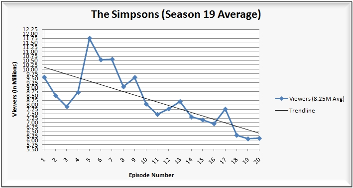 • 8:00 p.m.: The 19th season finale of The Simpsons (3.7/6 HH rating/share, 6.11M viewers, 2.9/9 A18-49 rating/share).  Boy, what happened to the Simpsons huh? Just take a gander at that chart below.  The series hit a high mark with episode five (11.74M viewers) and went downhill from there with a season average of just 8.25 million viewers (30% off from that high mark).  These numbers aren’t terrible as it still does well in the key A18-49 demographic, but all you really have to do is look at where the series finished last season.  Year-to-year, the show is off 3.83 million viewers/39% and 36% among adults 18-49.