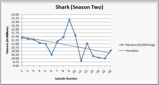 • 10:00 p.m.: The second season finale/series finale of Shark (7.1/11 HH rating/share, 10.55M viewers, 2.5/6 A18-49 rating/share).