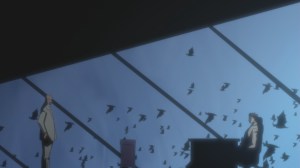 Detective Crispus Allen (left) discusses his distrust of Batman with Lieutenant Gordon as a flock of bats passes the windows.