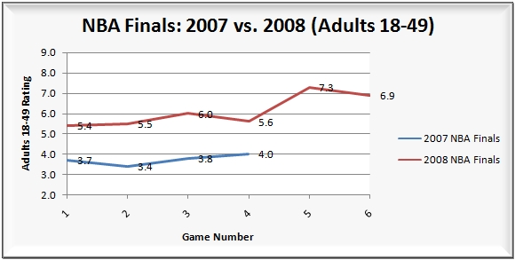 To make a fair comparison, the first four games of the 2008 Finals pulled in a 8.8/15 HH rating, 13.79M viewers and a 5.6/17 A18-49 rating (vs. the 2007 Finals (Games 1-4): 6.2/11 HH rating, 9.29M viewers, 3.7/12 A18-49). That puts the gain against the first four games of the 2007 finals at a remarkable 41.94% among households, 48.44% among viewers and 51.35% among adults 18-49.