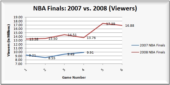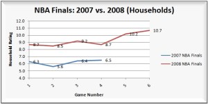 Last year when the the NBA Finals were experiencing a significant year-to-year decline, I put together a complete analysis of the game by game and year-to-year numbers (read it here).  Considering just how much stronger the series rated this year compared to last, I thought it would be interesting to take a look at the ratings for the 2008 NBA Finals.  So keep on reading for a full on look at the ratings from game 1 through game 6.  Needless to say (as you can see from the graph tease above), there was a major improvement.
