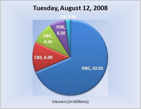 • 9:00 p.m.: 2008 Summer Olympics-Primetime (17.9/28 HH rating/share, 30.47M viewers, 10.3/26 A18-49 rating/share).