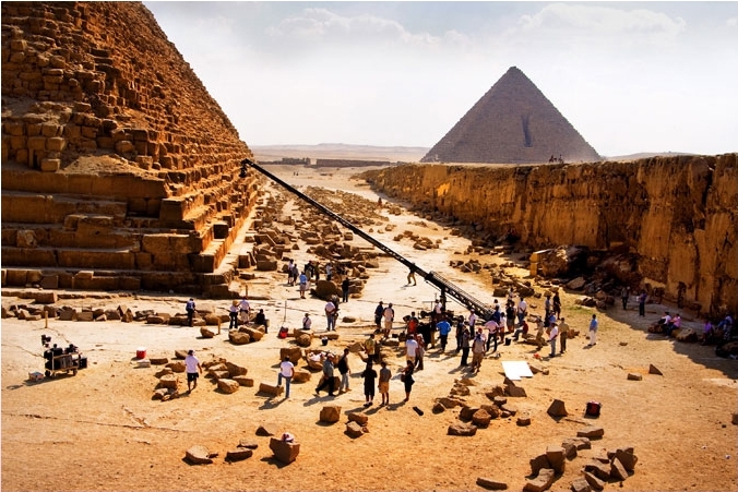 After completing work in New Mexico, the cast and crew moved to Giza for scenes at the actual pyramids, getting first-time access to the 5,000-year-old site from the Egyptian government. “It plays a big plot point,” Bay says, noting that they were allowed to shoot on the pyramids — not just around them.