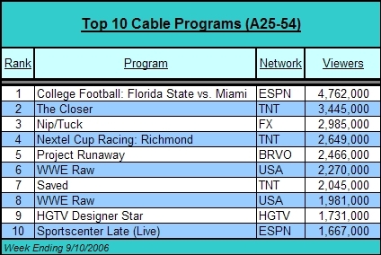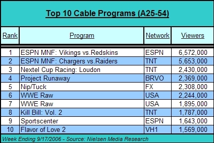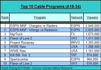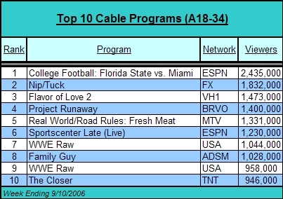 Here are the top 15 cable programs for the week ending 9/17/2006 in terms viewers and the top 10 cable programs in A18-34, A18-49 and A25-54.