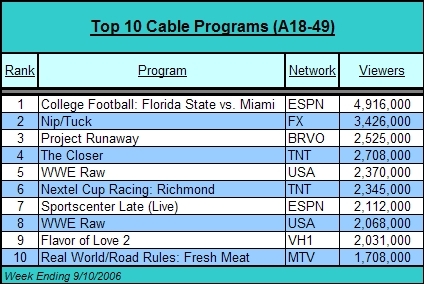Cable TV Ratings for Week Ending 9/10/2006 September 17, 2006 4:41 pm
