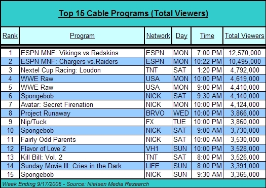 Cable TV Ratings for Week Ending 9/17/2006 September 24, 2006 11:32 pm