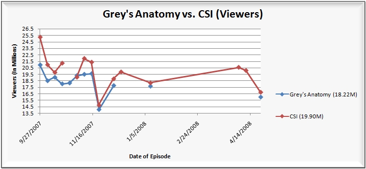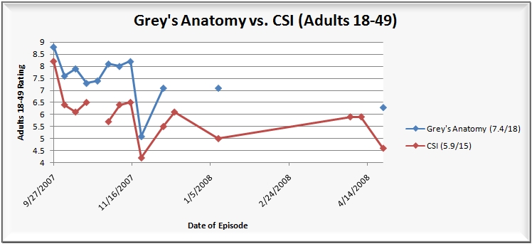 The head-to-head battle of CSI and Grey’s Anatomy remains competitive, but both shows drew lower-than average numbers. CSI was off the most (3.35 million/17% among viewers and 22% among adults 18-49), while Grey’s Anatomy was off by 1.66 million/9% among viewers and 11% among adults 18-49 from its last newly aired episode. Curious as to how the two shows have done against each other? Check out the following two CSI vs. Grey’s Anatomy charts–VIEWERS ||| ADULTS 18-49.