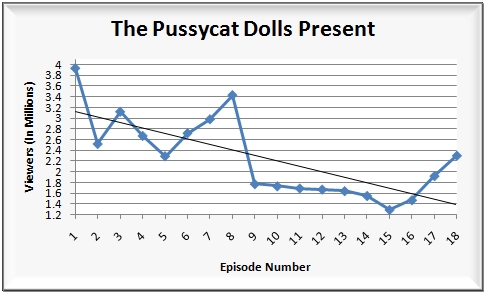 Meanwhile, the season two finale of Pussycat Dolls Present broke the 2 million mark for the first time this season (2.30M). Overall though, the second season of the series was a big disappointment, averaging just 1.70 million viewers and a 0.8/2 rating/share among adults 18-49 over nine episodes. To put that in perspective, the first season of the show averaged a significantly better 2.96 million viewers and a 1.3/3 rating/share among adults 18-49 over eight episodes. That’s a drop of 1.26 million/43% among viewers and 38% among adults 18-49 (click here for a season 1-2 ratings chart).