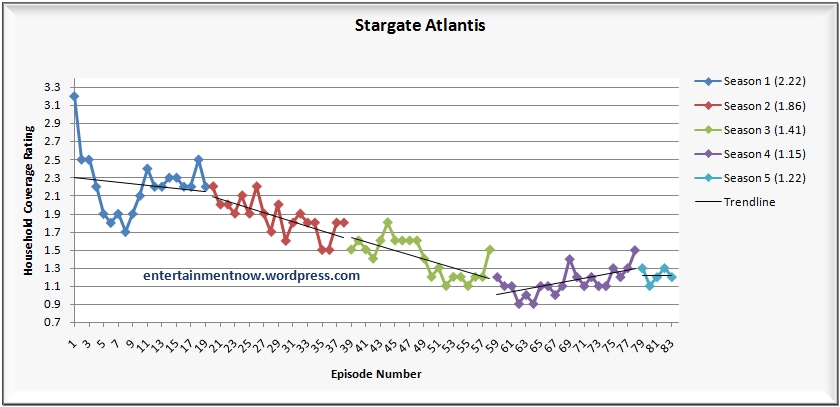 Through three weeks (we don’t yet have the numbers for the fourth episode of the season that aired this past Friday) Stargate Atlantis has averaged a 1.2 household rating. That’s slightly above what the fourth season averaged through episodes (1.1 household rating).